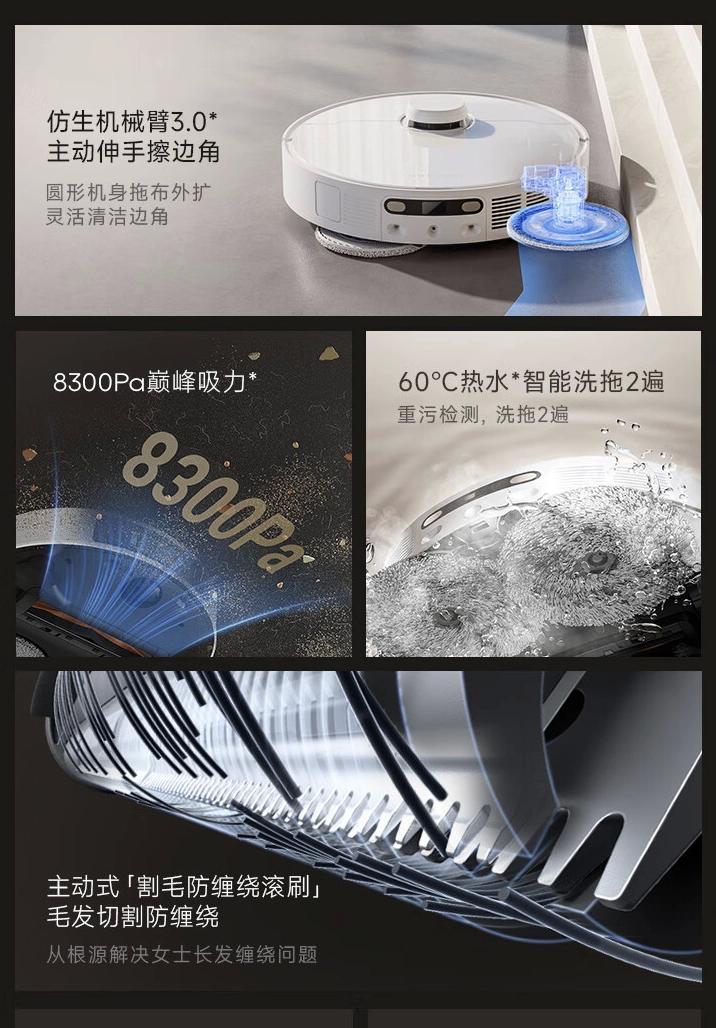性能极为出色。这款设备装备了3.0版的仿生机械臂,因此在应对清洁工作时表现得更为灵巧。它具备高达8300Pa的强大吸力 ,无论是地面上的灰尘、毛发,抑或是难以触及的角落污渍,都能轻松清理干净 。借助双线3D结构光技术 ,设备能精确识别障碍物和清洁区域,有效防止碰撞和遗漏。这款产品额外具备60度热水洗拖把的功能,能更深入地清洁拖把,确保清洁效果出色。即便遇到难以去除的污渍 ,智能的反复清洗和拖动功能也能轻松解决。